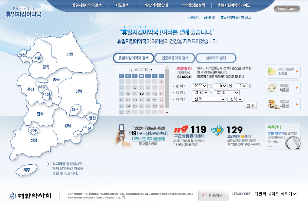 전국에 있는 약국을 안내해주기에 현재 자신이 위치한 지역을 클릭하여 공휴일에 영업 중인 약국을 찾을 수 있습니다.
